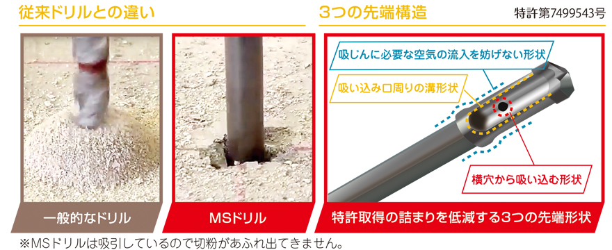 ◎穿孔と同時に粉じんを吸引し、孔内清掃が不要◎特許取得の先端構造で詰まりを低減