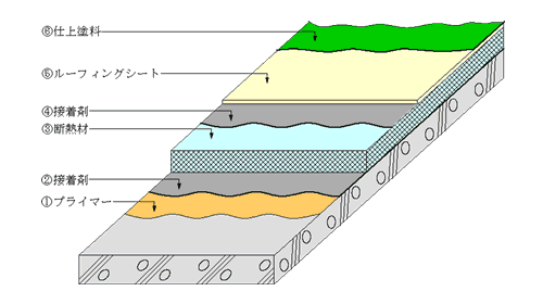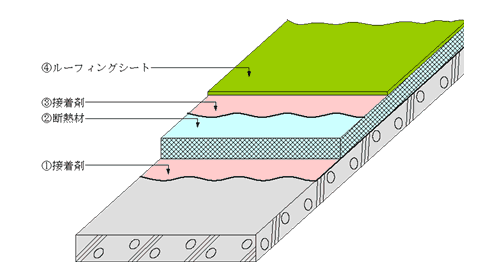 露出断熱接着工法(F401工法)は断熱材を使用することによって、断熱効果と併せて、下地のムーブメントに対しても緩衝効果を示し、シートの応力を緩和する工法であり、断熱を目的とする非歩行の屋根に適用する。なお、ALCパネル下地表面調整材で目止めする場合がある。